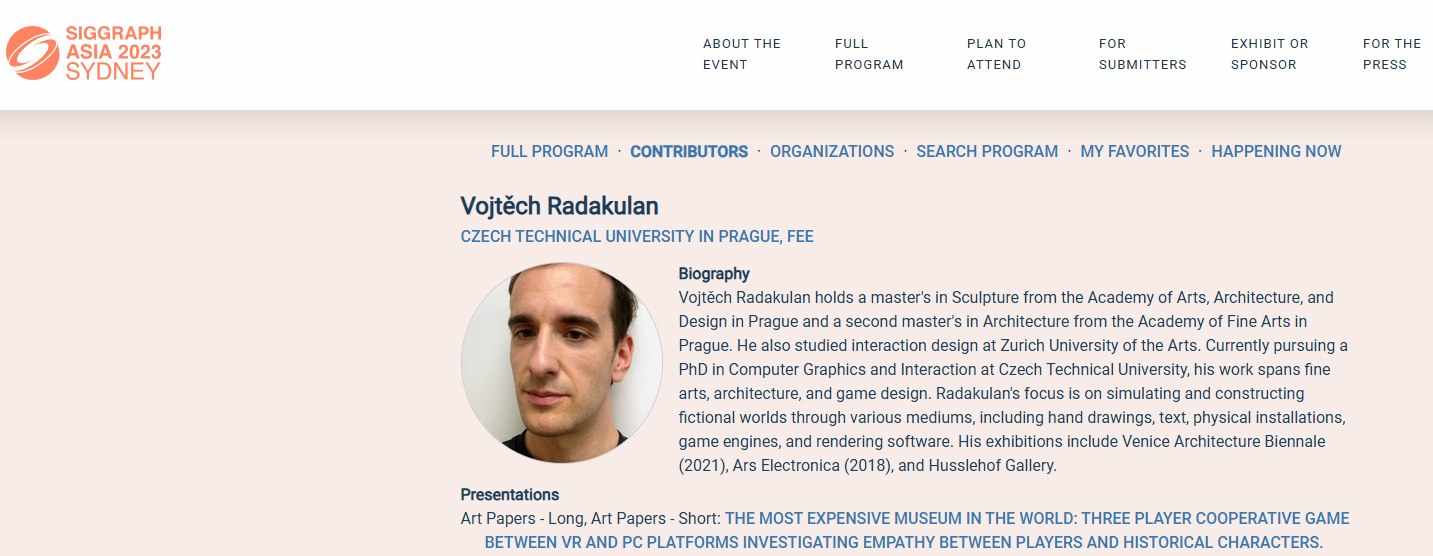 1.2025:New part from an ongoing piece about Marie Curie Sklodowska at GHMP Prague. Drawings and a game about risks and rewards of nuclear power. 4.2024:Zwentendorf piece is again on route. This time in the Austria atFotogalerie Wien. Curious about the opinion of austrians. 3.2024:Did you always wondered how does it feel to be a brick? Try so at Big Golden Eyes. Exhibition about 35 years of Jindřich Chalupecký prize. 2.2024:My game is shown at SEFO Triennial. Touch houses and avoid trouble. 1.2024:Did you always wanted to eat dirt or do some other random stuff? Go to a Keyhole - a space with physical games I designed. 8.2023:I go to Sydney to talk about background of my piece about Zwentendorf nuclear power plant at Siggraph Asia conference. 7.2023:I made a new piece for Released atoms in Fotograf gallery prague. Surprisingly, you can become an uranian stone and vote about a landscape. 6.2023:I contributed something to a Conference on nothing. I disguiesed myself as a security guard. 5.2023:I am part of a group show CTRL+O. In Montenegro. 4.2023:I reconstructed Ernestium at Ernestinum Příbram. Enter Ernestinum and find out how was it to be a medieval monarch. 3.2023:I reconstructed Drtikol´s studio at Ernestinum Příbram. Become a light, sculpture or a camera in virtual reality. 2.2023:My nuclear story about Zwentendorf goes to a 35m2 gallery. Hear a story about kids yelling about killing each other. 1.2023:Taking part in a multiplayer show in Okraje. Laggy green stone on the show. 7.2022:I extended Soft Arena in GFD Příbram. It is more soft now. 6.2022:Lots of game and one of mine at Gamifikace. Exhibiting some older pieces. 5.2022:I am part of a group show as an artist and architect of Tapping the Egg: Columbus Then and Now. I drew an egg on the floor and it broke. 4.2022:See and steal a column at Festival waiting for change.. 3.2022:I am part of a group show Recipes for Hapinnes. Pc game about czech socialist housing goes to display.cz. Also did architecture desing for the show. 2.2022:I am part of a group show Beyond Nuclear Family. Pc game about czech socialist housing goes to New York. 1.2022:Me and my head have recieved Jindrich Chalupecky Award. Also sun is very bright. 12.2021:A special recognition in competition for art object in Prague went my way. Check other ways too! 11.2021:Extension of the Soft Arena is getting closer and softer. 10.2021:I am PhD candidate in informatics at Czech Technical University, department of computer graphics and interaction. Researching optical illusions in virtual reality. 09.2021:Doing architecture design for graphic biennale in Ljubljana, introducing offices to gallery. 08.2021:I am at residency at RUK slovenia, developing a VR app about winemaking. No drinking option though. 07.2021:I am at residency in Budapest galeria, drawing copies of trees. 05.2021:The Hungarian pavilion with my contribution at this year Venice Biennale is finally open: 01.2021:Beta version of a new mini PC game On the Future Garden is waiting for your visit in Bubec sculpture studio! 12.2020:The so called Soft Arena is waiting for your visit in Gallery of František Drtikol! 10.2020: Stay tuned as I work on a new VR playground for small people (kids) and big people (adults). 09.2020: As a member of White plastic Exhibition in Pragovka Gallery I have contributed with a piece called Sun in a Hollow Earth. 07.2020: I am taking part in exhibition Beyond Nuclear Family pop-up, contributing with a work in progress PC game called Visitors. 07.2020: I participated on an exhibition in ETC gallery in Prague, called Walking through. 05.2020: I am taking part in 2021 Venice Architecture Biennale as a member of Othernity.eu 06.2020: Nová počítačová hra ke stažení na /mlha nebo vystavena až do 1.10 v rámci festivalu M3 My new PC game Fog is out (English version coming out soon)